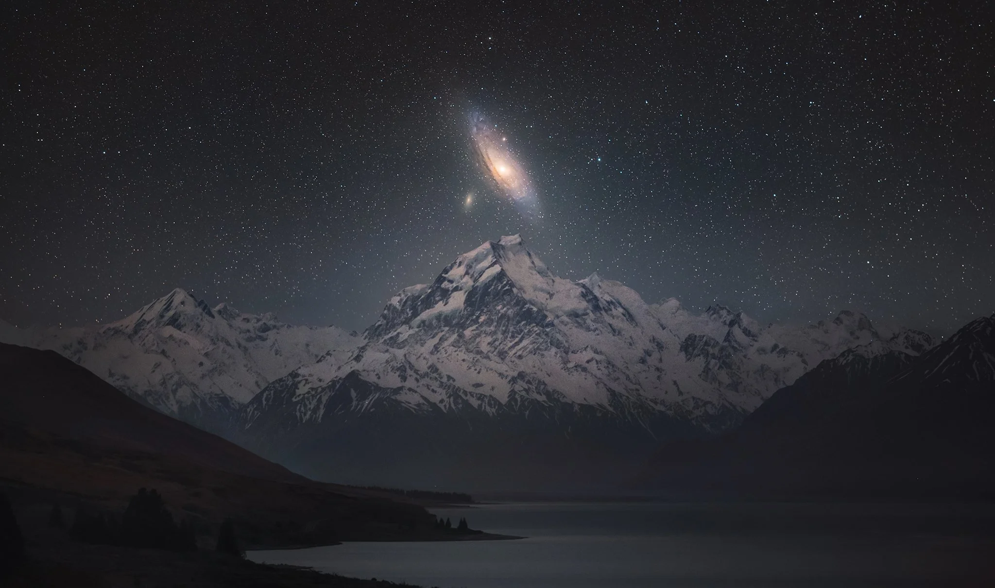 用于创作这张图像的所有照片,都是在距离山脉约 50 公里的地方同步拍摄的。由于仙女座星系(在天空中的)高度较低,再加上对月相、气辉、天气和温度的严格时间要求,这张照片的拍摄极具挑战性,使得它成为新西兰境内尝试这类构图的极少数作品之一。