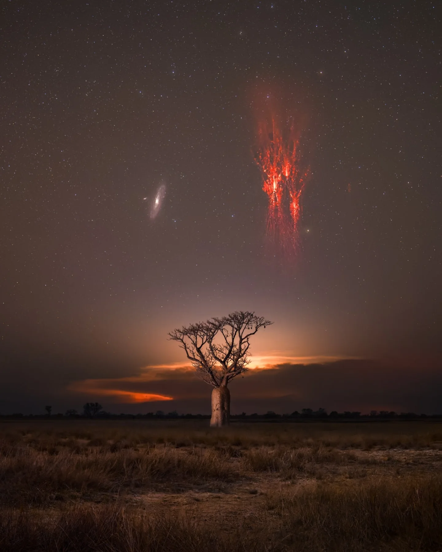 这几乎就是我两年来梦寐以求的那张照片。在这个无比特别的夜晚,我见证了两个光影世界共享同一片天空。一棵孤零零的猴面包树后方,一道红色精灵突然闪现 —— 那光芒转瞬即逝,快到我都来不及反应。而在它身旁,仙女座星系虽微弱却永恒,其古老的光芒穿越时空,与那场雷暴的电脉冲相遇。就在那一瞬间,地球上最为短暂的光,与我们能观测到的最古老的光,并肩而立。