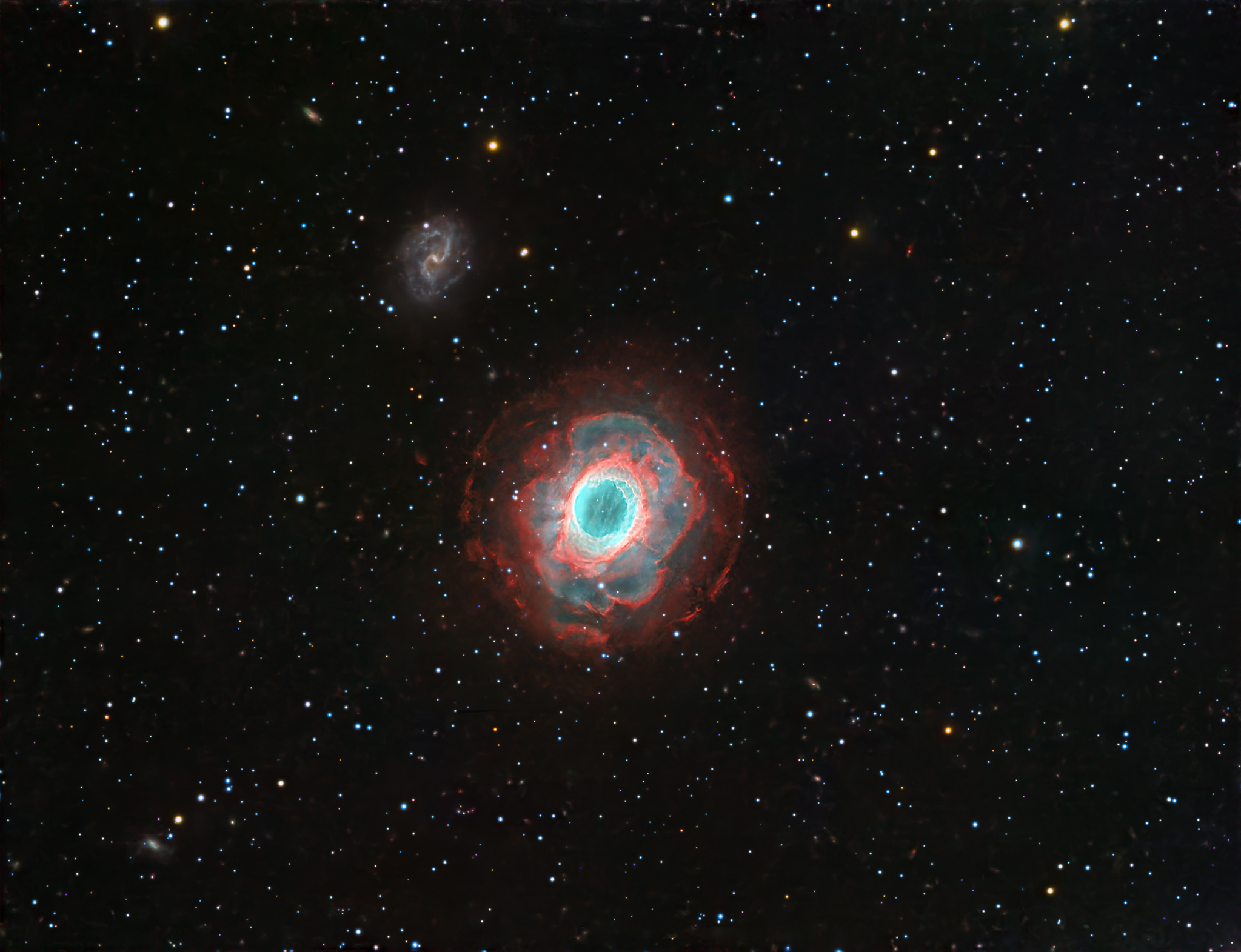 环状星云内部所有区域均呈蓝绿色调,这一颜色由二次电离氧(O III)在 495.7 纳米和 500.7 纳米波长处的发射线所致。而在环的外围区域,部分红色则来自氢元素在 656.3 纳米波长处的发射线。