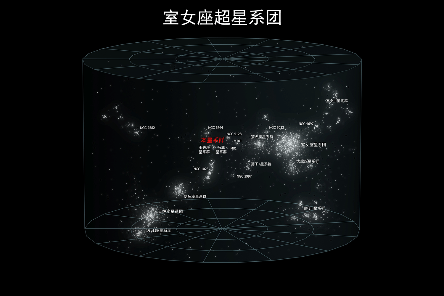 包含了约2万个星系,100多个星系团和星系群,超星系团质量中心为距银河系6000万光年的室女座星系团,本星系群只是室女座星系团的一个小星系纤维。除向质量中心室女座星系团运动外,超星系团内的大部分成员都以600km每秒的速度向遥远的“巨引源”移动。