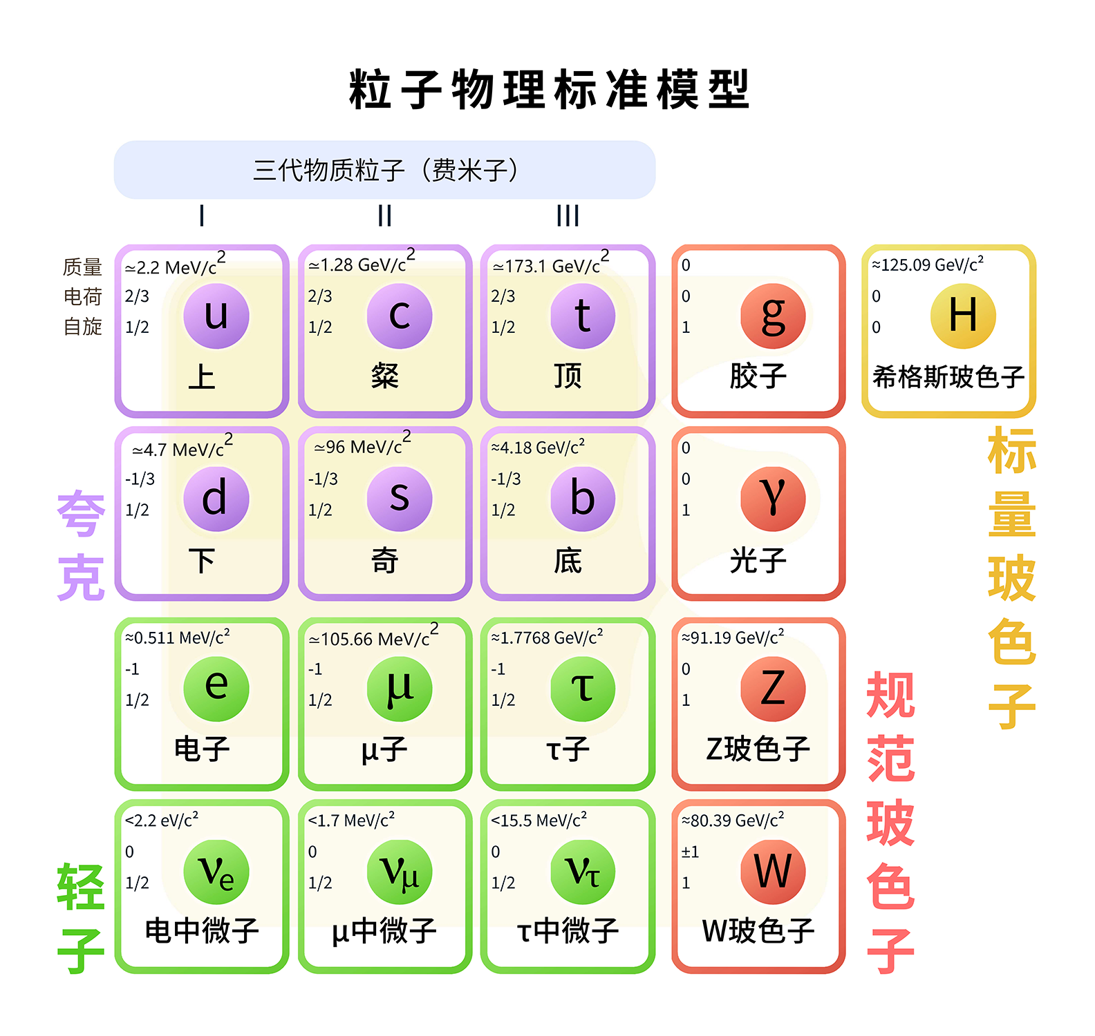 - 规范玻色子——是传递相互作用力的基本粒子——有光子、胶子、W和Z玻色子,引力子(未证实)。