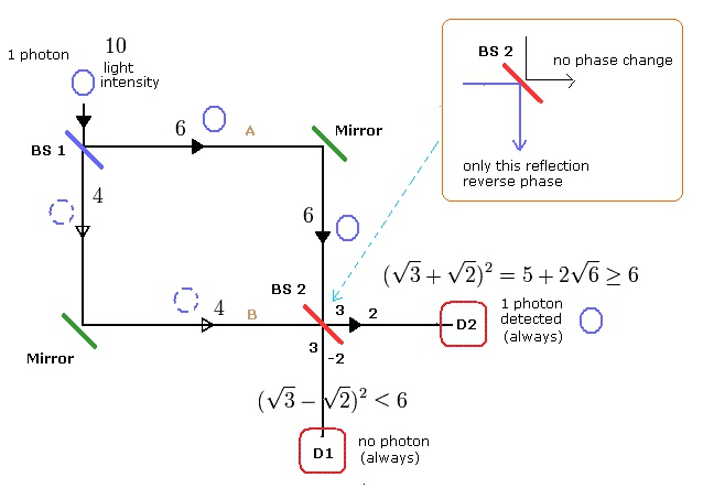 这说明了,一个光子进入第一个分束器,同时穿过和被反射,然后按照两条路径运行的光子,同时进入第二个分束器的两面,又继续同时穿过和被反射。