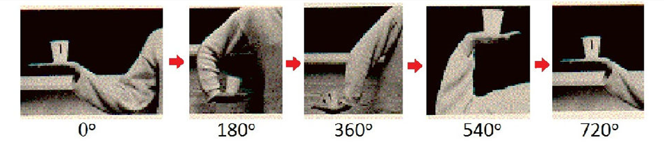 费曼的水杯自旋表演,360度到540度,需要手过头顶才能完成,图片来自科学网《统一路-7-奇妙的旋转2》