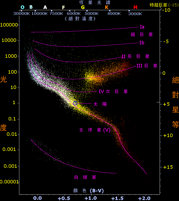 赫罗图,是指恒星的光谱类型与光度之关系图,绝对星等是恒星的亮度,数值越小越亮,光谱型是恒星的温度分类系统,依恒星光谱的类型,把恒星分成O、B、A、F、G、K和M等类型,每个光谱都可进一步分为数字亚型,范围从0到9,更高的数字表示更低能的光谱和更红的颜色。在数字后面加上罗马数字或字母表示恒星演化阶段(如太阳光谱型为G2V)