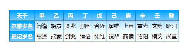 大岁在甲曰阏逢,在乙曰旃蒙,在丙曰柔兆,在丁曰强圉,在戊曰著雍,在己曰屠维,在庚曰上章,在辛曰重光,在壬曰玄黓,在癸曰昭阳。——岁阳。