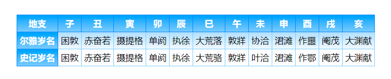 大岁在寅曰摄提格,在卯曰单阏,在辰曰执徐,在巳曰大荒落,在午曰敦牂,在未曰协洽,在申曰涒滩,在酉曰作噩,在戌曰阉茂,在亥曰大渊献,在子曰困敦,在丑曰赤奋若。
